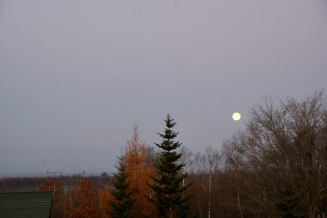 朝6時の西の空にはまだ月が出ていました。稜線に近いところで見えていたので天気が良くなりそうです。遅れていたハウスのビニール外しと畑の整理ができそう。