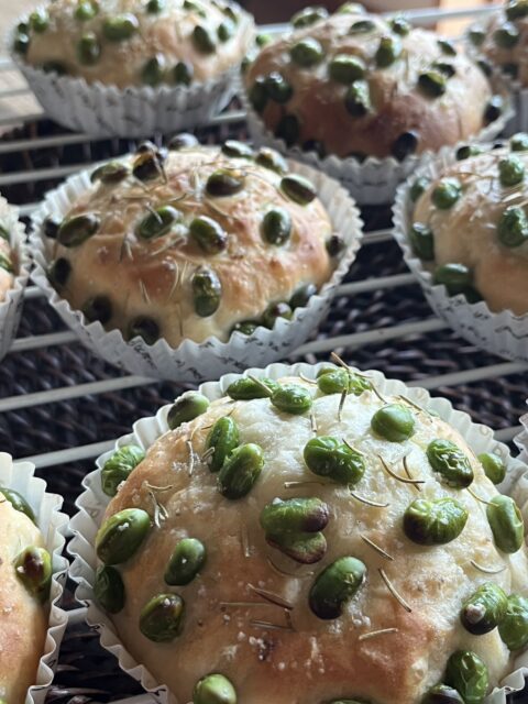 本日のパンはスイートコーンがたっぷりの「コーンパン」と枝豆(湯上り娘)たっぷりの「枝豆フォカッチャ」、マッシュポテトやチーズたっぷりの「ポテウィッチ」です。